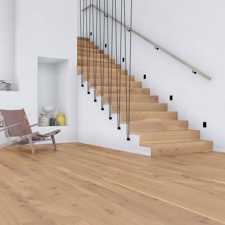 Drvene stepenice savršeno upotpunjuju estetiku svake prostorije. Uz svaki parket nudimo idealno usklađene stepenice u istom formatu, vrsti drva, boji i površinskoj obradi. Naš jedinstveni dizajn stvara besprijekornu cjelinu, gdje se pod i stepenice stapaju u jedinstven, skladan prostor. Nudimo prilagođena rješenja vrhunske kvalitete, što ih čini idealnim i za renovacije. Postojeće se stepenice mogu jednostavno prilagoditi vašem novom parketu, osiguravajući elegantan i besprijekoran prijelaz.